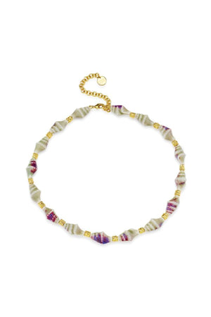 The Trevi Necklace by Amber Sceats captures coastal elegance with a modern twist. Handcrafted in Italy, this 24K gold-plated statement necklace features delicate ceramic shells that bring a touch of Mediterranean charm to any look — perfect for summer events or elevated everyday styling.