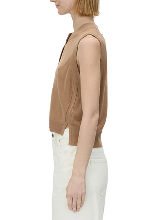 Introducing the Cardinal Sleeveless Knit Cardigan Tan by Camilla and Marc, a modern layering piece crafted from a soft cotton blend. Designed in a cropped, relaxed silhouette, this cardigan features a sleeveless cut with side splits at the hem, offering a clean yet versatile finish for transeasonal styling.