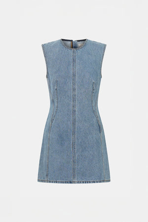 Introducing the Maja Denim Dress Light Vintage Blue by Camilla and Marc, a high-neck mini dress in a vintage blue wash, tailored with a fitted silhouette and clean lines. Made from 100% cotton denim with a secure back zip closure for an elevated finish.