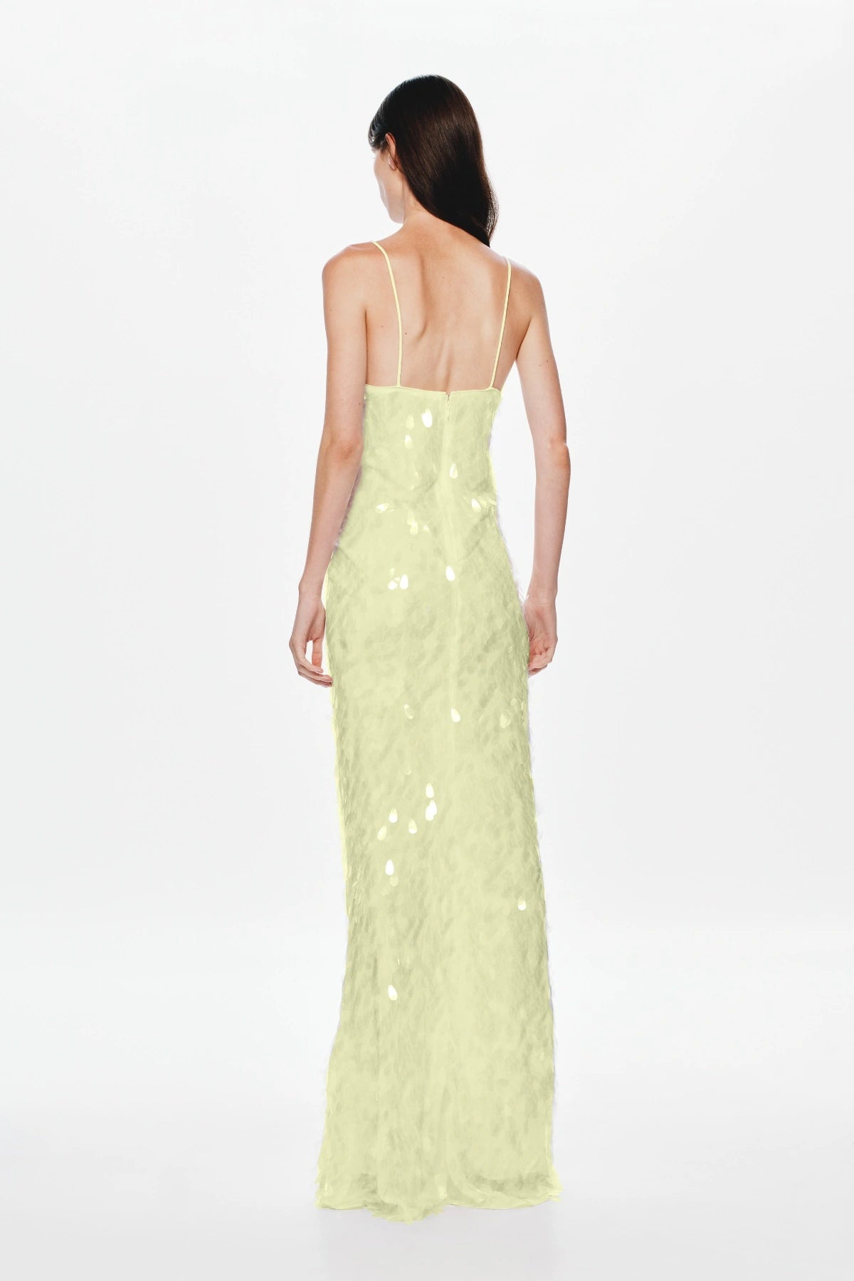Introducing the Sapphire Sequin Maxi Dress in Lemon by Misha — a luminous, light-catching silhouette designed for statement event dressing. Crafted in a bold lemon hue, this maxi gown features a plunging neckline, low back, and fluid sequin embellishment that moves beautifully with the body. Elegant yet playful, Sapphire is made for evenings that call for shimmer and confidence.