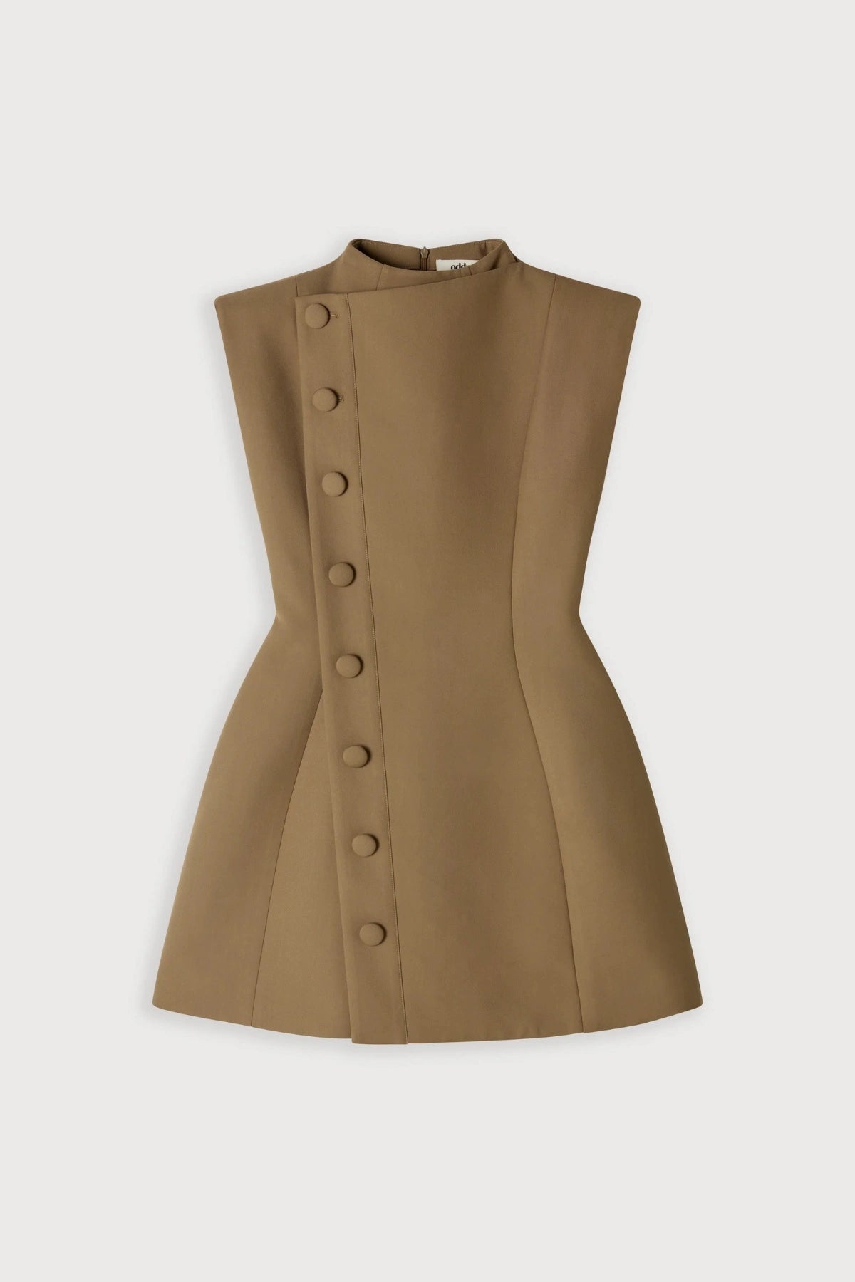 Introducing the Sleeveless Button Detail Mini Dress in Khaki by Odd Muse — a tailored mini crafted with the brand’s signature cinched waist and flattering dart detailing. Finished with statement buttons and a discreet zip, it's a sophisticated choice for year-round occasions.