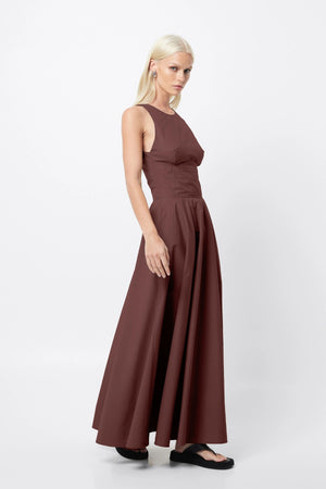 Introducing the Homage Maxi Dress in Chocolate by Mossman — a refined sleeveless shirt dress crafted from 100% crisp cotton. With its fitted torso, stitched waist detailing, and softly flared A-line skirt, this silhouette balances structure with ease. Minimalist yet polished, it's perfect for warm days or elevated everyday wear.