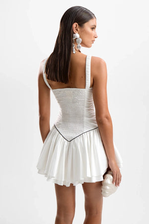 Introducing the Cin Cin 'Juliette' Mini Dress in Pearl – the ultimate main character mini. Crafted from 100% cotton, this ultra-feminine silhouette features a tapered bodice and a soft, double-layered tutu-style skirt for a playful yet refined finish. Elasticated shoulder straps and a centre-back zip add both comfort and structure, making it perfect for parties, events, or elevated summer moments.