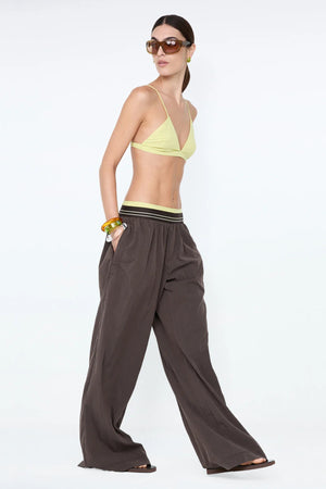 Introducing the Jerri Wide Leg Pant by Bec + Bridge, a relaxed yet elevated wardrobe essential crafted in lightweight nylon. Featuring a custom stripe elastic waistband and gathered waist, these wide-leg pants offer effortless movement and comfort—perfect for holiday dressing or casual-chic styling.