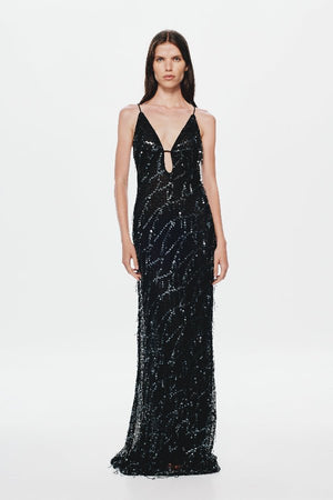 A vision of modern glamour, the Onyx Sequin Dress by Misha is designed to make a lasting impression. Crafted with shimmering sequin embroidery on sheer mesh, this floor-length gown features a plunge neckline, delicate front keyhole, and slim straps for a sleek, feminine silhouette. Complete with an open back and full lining, it’s a statement piece destined for black-tie events, galas, and unforgettable nights out.