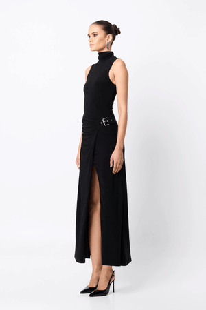 Introducing the Mossman Rebellion Maxi Dress in Black. A contemporary classic, this figure-hugging silhouette is crafted from premium stretch jersey and detailed with a high neckline, wrap front, and adjustable buckle. Finished with a daring front split, it’s the perfect desk-to-dinner statement piece.