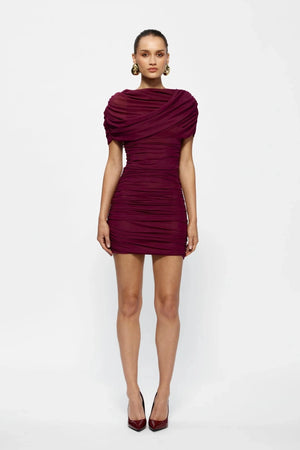 Introducing the Effie Kats Phoenix Mini in Burgundy, the perfect mini dress to transition into the warmer seasons. Crafted from our signature soft mesh, this dress features sculptural ruching that beautifully contours the body, with a detailed drape across the shoulders for added elegance. Designed with a flattering short cut, this piece is slightly sheer, offering a hint of allure for any occasion. A true wardrobe staple, the Phoenix Mini combines chic design with a comfortable fit.