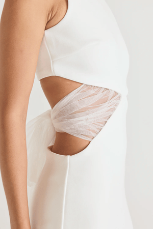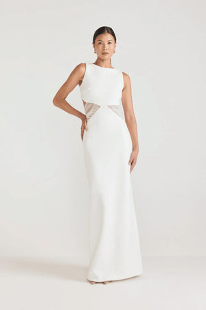 Introducing the Tojhà Bellina Dress in Black. A sleek and sculptural silhouette, the Bellina is crafted from ultra-soft double bonded crepe with a boat neckline and a statement waist cut-out, elegantly detailed with a layered mesh tie. Fully lined and finished with a back split and invisible zip, this maxi is your modern evening go-to.