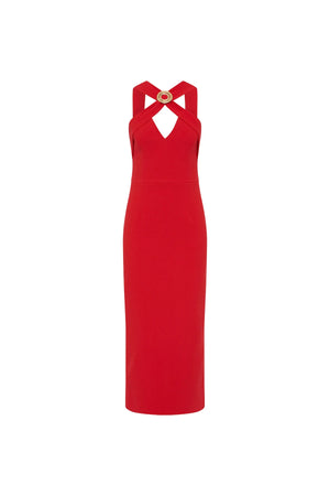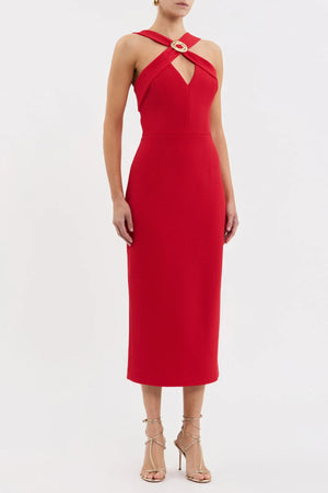 Introducing the Rebecca Vallance Cameron Midi Dress in Red. Crafted from bonded crepe, this captivating dress features a V halter neckline with gold detailing and a fitted bodice supported by internal boning for structure. Princess seams and a cinched waist flatter the silhouette, while the pencil midi skirt is refined with a back split for ease of wear. Fully lined and secured with an invisible zip fastening at the back, Cameron embodies chic sophistication for your next occasion.