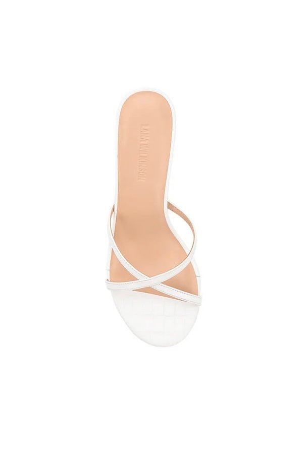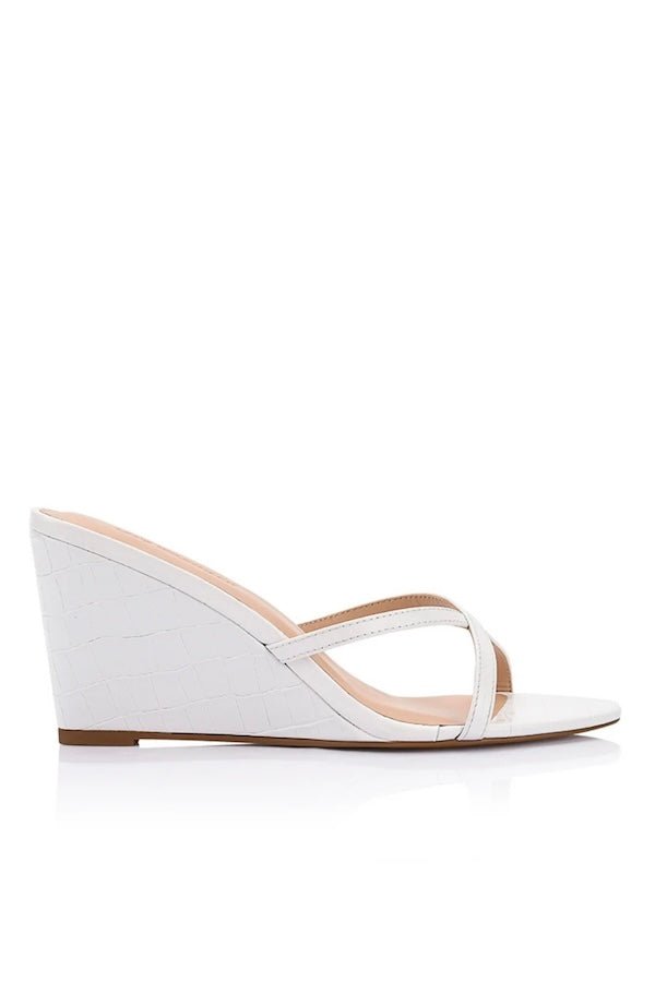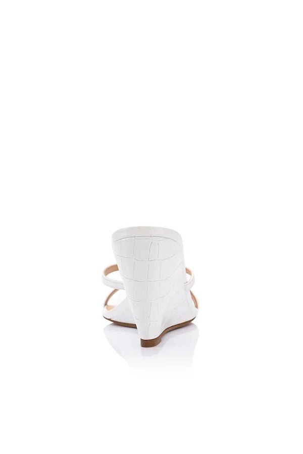 Add a touch of contemporary elegance to your wardrobe with the Tilly sandal in bright white croc-embossed leather. Its sleek wedge-heel mule design features intertwined straps for a refined yet effortless look. The round toe ensures all-day comfort, making this sandal perfect for dressing up casual denim or completing a chic, laid-back outfit.