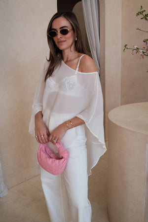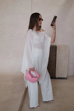 Our Riley Sheer Poncho in White by Sneaky Link - is ultra light, fluid, and effortlessly cool. Designed to drape with ease, this sheer layer adds an element of allure to any look. Perfect for styling over the Kat the Label Maverick Underwire Bra in white - a timeless pairing that balances delicacy and confidence.