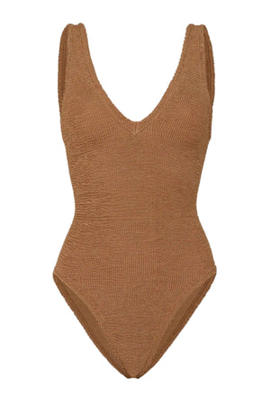 Introducing the Sadie Swim in Metallic Cocoa by Hunza G — a forever piece in shimmering Metallic Cocoa. With a deep plunging neckline and classic one-piece cut, this silhouette is equal parts sophisticated and effortless. A versatile swimsuit designed to flatter, stretch, and stay timeless, no matter the occasion.