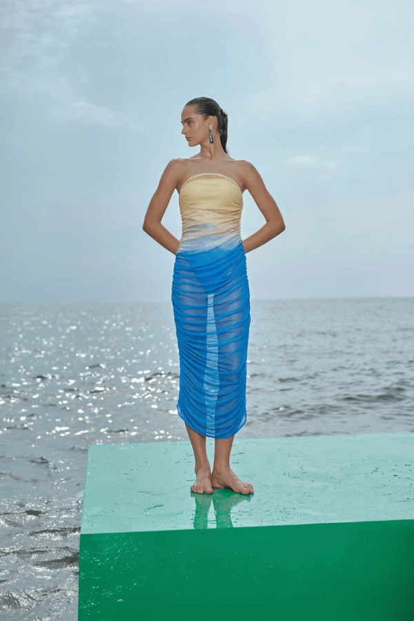 The Bahia Pareo in Arctic is a versatile, maxi-length cover-up designed from semi-transparent, elastic fabric that drapes gracefully. Its ruched detailing enhances its elegant appeal, making it perfect for beachside lounging. Wear it as a classic pareo or transform it into a chic strapless dress for effortless style.