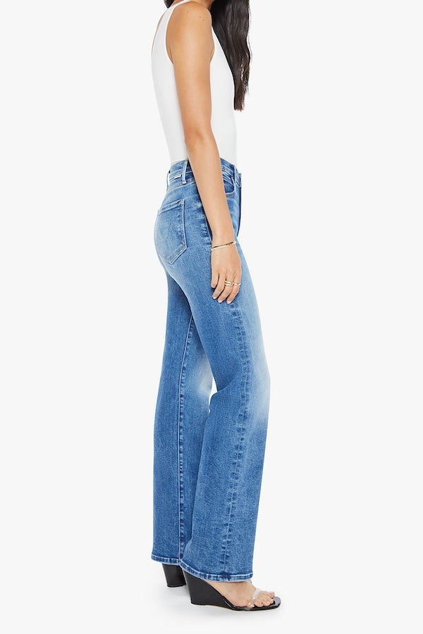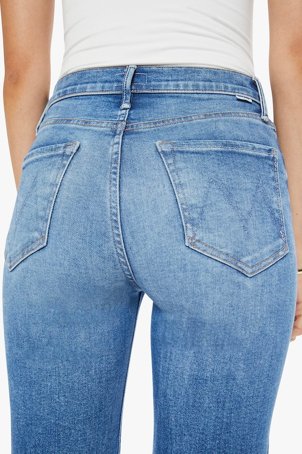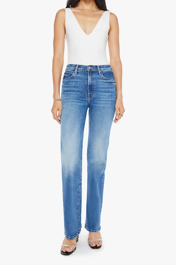 Introducing the MOTHER's radical a high-rise straight leg jean with a 32-inch inseam and a clean hem. Cut from stretch denim, Bitchin' is a mid-blue with whiskering and fading at the knee.