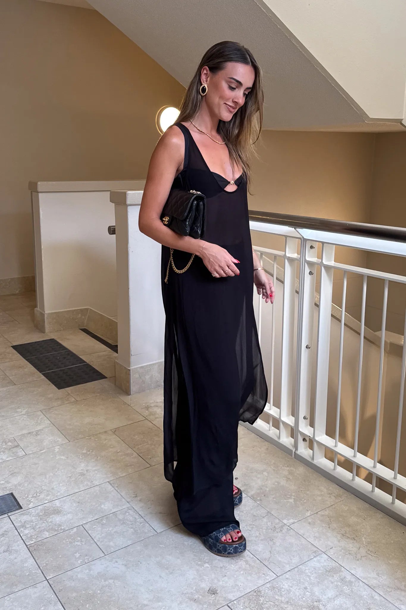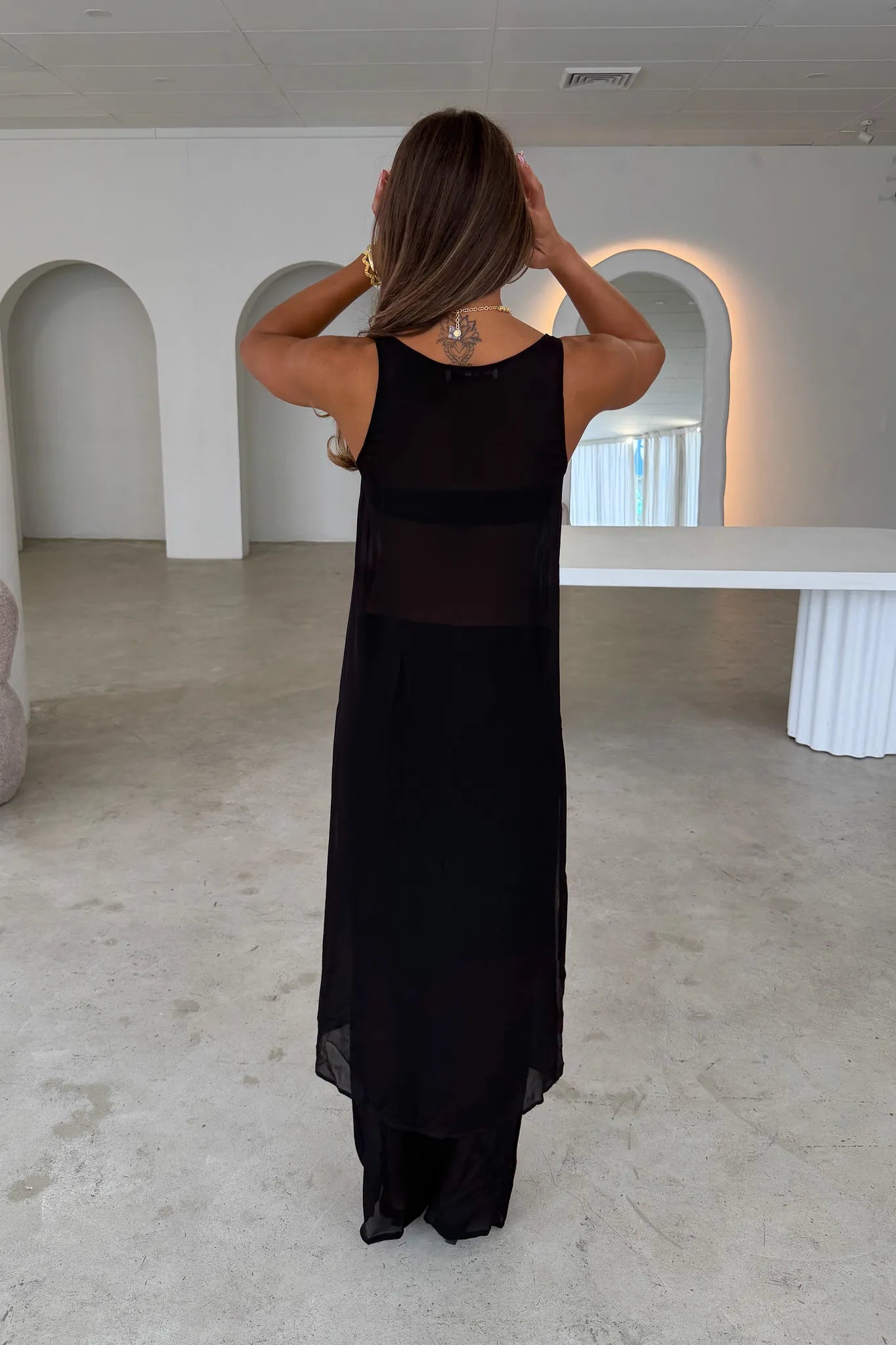 The Sheer Pant in Black by Sneaky Link a high-fashion statement for the bold minimalist. Crafted from fluid 100% viscose, these transparent trousers feature an easy elastic waist for effortless edge. A total compliment-magnet; pair with the matching Sheer Tunic Dress for the ultimate trend-forward set.