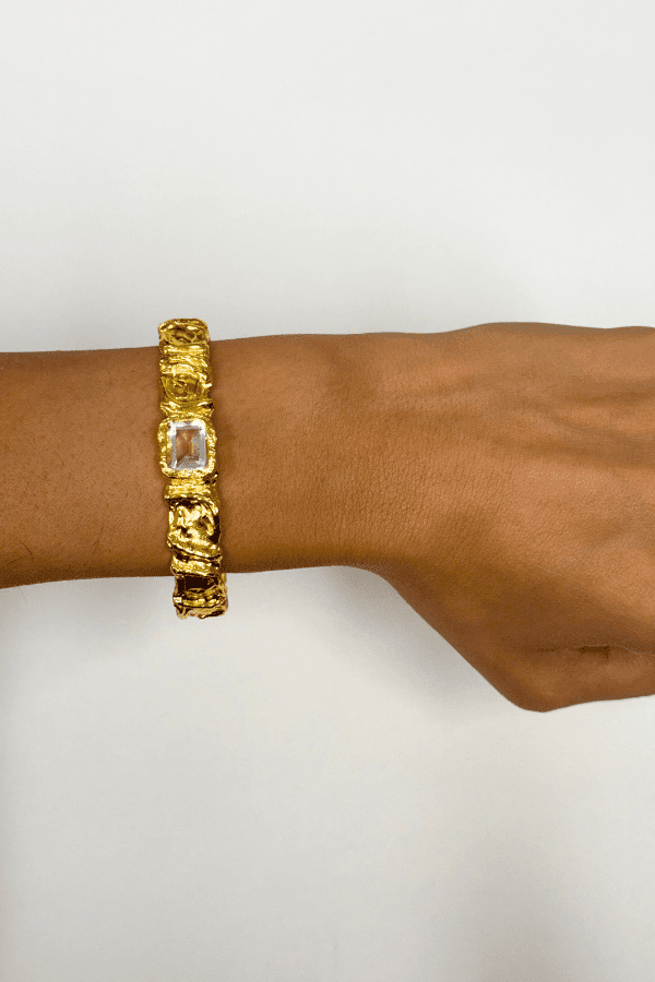 The Dahlia Bracelet features exquisite 24K gold plating and sparkling cubic zirconia stones, all expertly handcrafted in Italy. This timeless piece is a must-have for every jewelry collection, adding an elegant touch to any ensemble, whether you're dressed up or dressed down.
