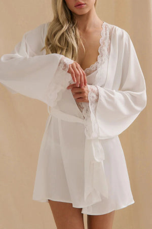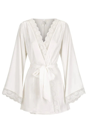 Introducing the Sidney Robe by Kat the Label, a timeless satin robe adorned with delicate vintage lace trim. Designed with gathered shoulders and a tie waist, this ivory piece is perfect for elegant lounging or bridal preparations on your special day.