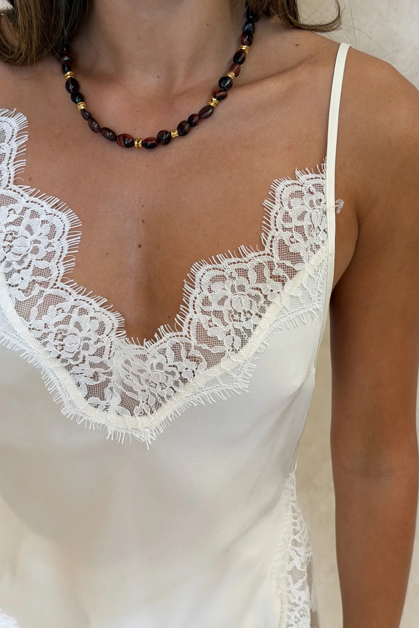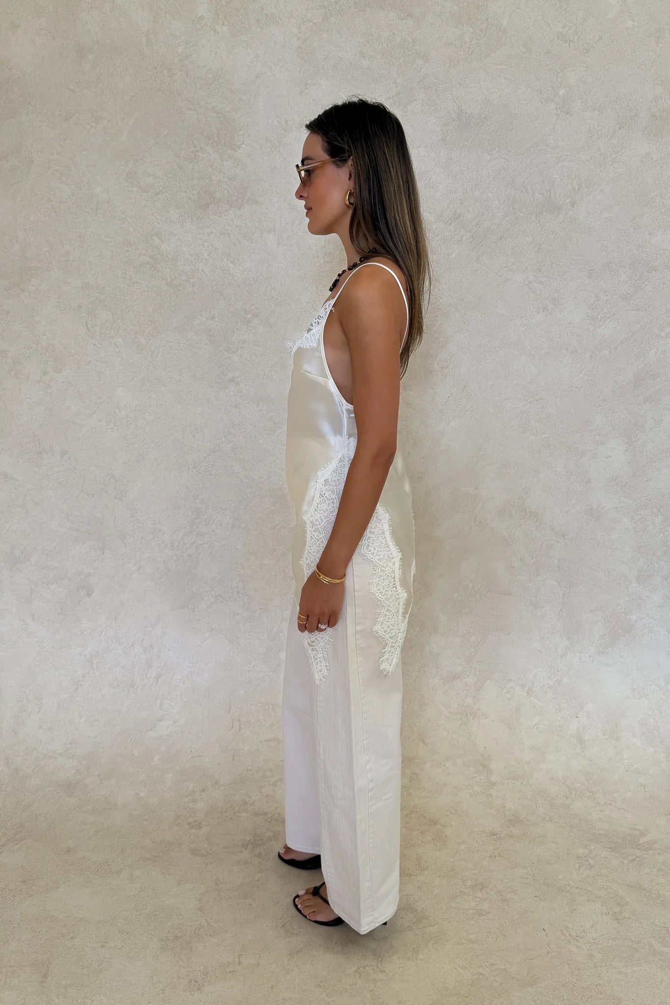 The Lilah Lace Trim Top in Ivory by Sneaky Link – a chic summer essential featuring a striking asymmetrical silhouette with beautiful white lace trim. Designed with a flattering V neckline and a single adjustable strap, this top blends modern edge with feminine detail, making it perfect for elevated day looks or warm nights out.
