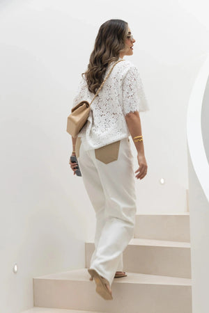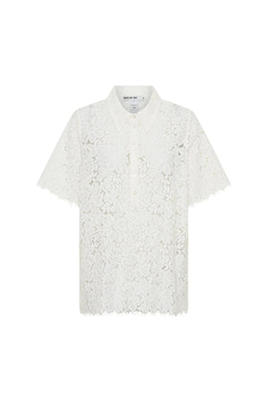 Jaz Hand Lace V Neck Shirt White by Sneaky Link, a collared staple reimagined in luxe lace. With its flattering V neckline and relaxed fit, this shirt pairs seamlessly with the matching Lace Elastic Pant in White for a chic set or styled solo for an effortless summer statement.