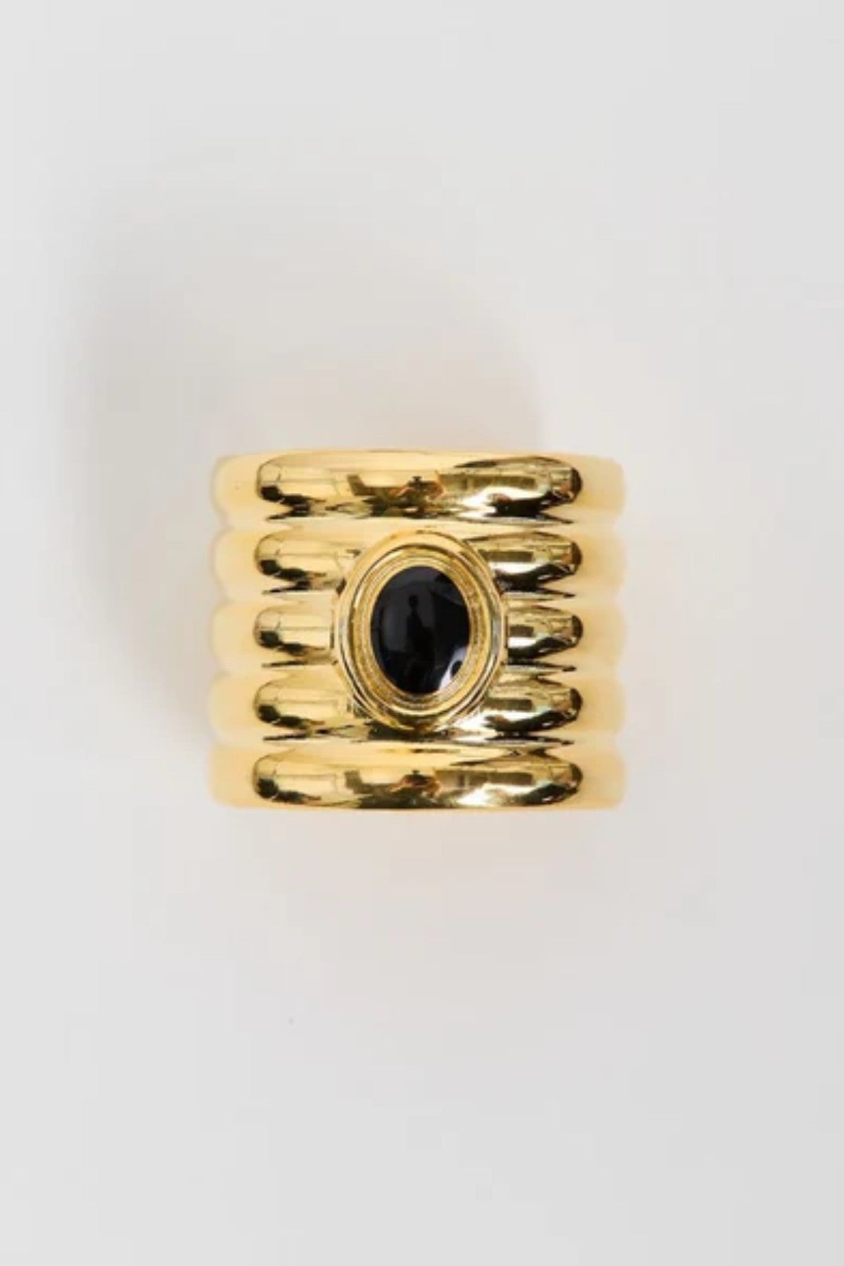 • Clarke Cuff by Heaven Mayhem – a gold sculptural cuff with ridged detailing and a black enamel center, perfect for bold refined styling.