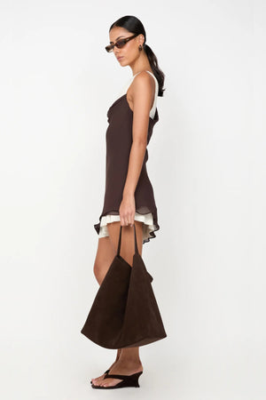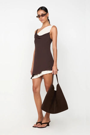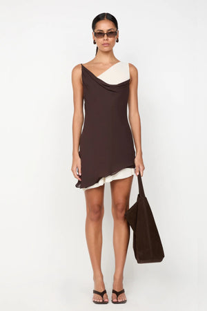 Introducing the Jehnaya Asym Mini Dress by Bec + Bridge, a bold silhouette in a striking dual-tone finish. Crafted in soft georgette, this asymmetric mini features a draped cowl neckline, knotted shoulder detail, and contrast buttercream mesh underlay for dimensional texture. Ideal for modern evening dressing or a standout night out.