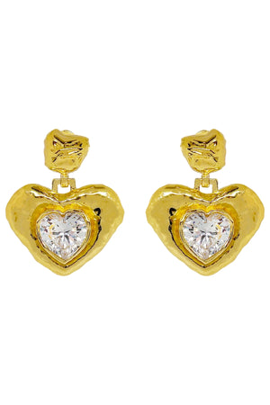 Introducing the Suri Earrings by Mountain and Moon, a modern reinterpretation of the classic heart motif. Hand-finished in radiant gold and set with a sparkling White CZ gemstone, these earrings blend traditional craftsmanship with contemporary femininity. Bold yet tender, they bring character and sentiment to any look—perfect for evenings, celebrations, or everyday statement style.