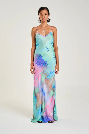 Introducing the Siren Maxi Dress H20 by Summi Summi, a timeless silhouette showcasing the hand-painted abstract artwork H2O. Cut on the bias for a flattering drape, this full-length dress features a v-neckline and adjustable straps, making it a versatile piece for both elevated daytime wear and evening occasions.