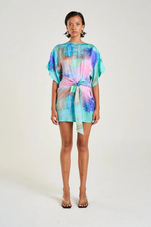 Introducing the Tie Front Dress by Summi Summi, a versatile mini silhouette adorned with the hand-painted H20 print. Crafted from a silky viscose-rayon blend, this piece features a wrap overlay with adjustable ties, a high neckline, and modest sleeves. Its refined drape and flattering cinched waist make it perfect for both polished occasions and casual styling.