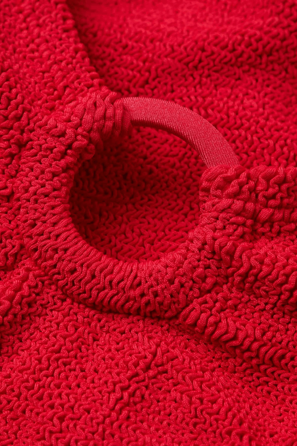 • Nadine Bikini With Tonal Hoops Red by Hunza G – Flattering one-size bikini with high-waisted bottoms, tonal hoops, and full bust support.