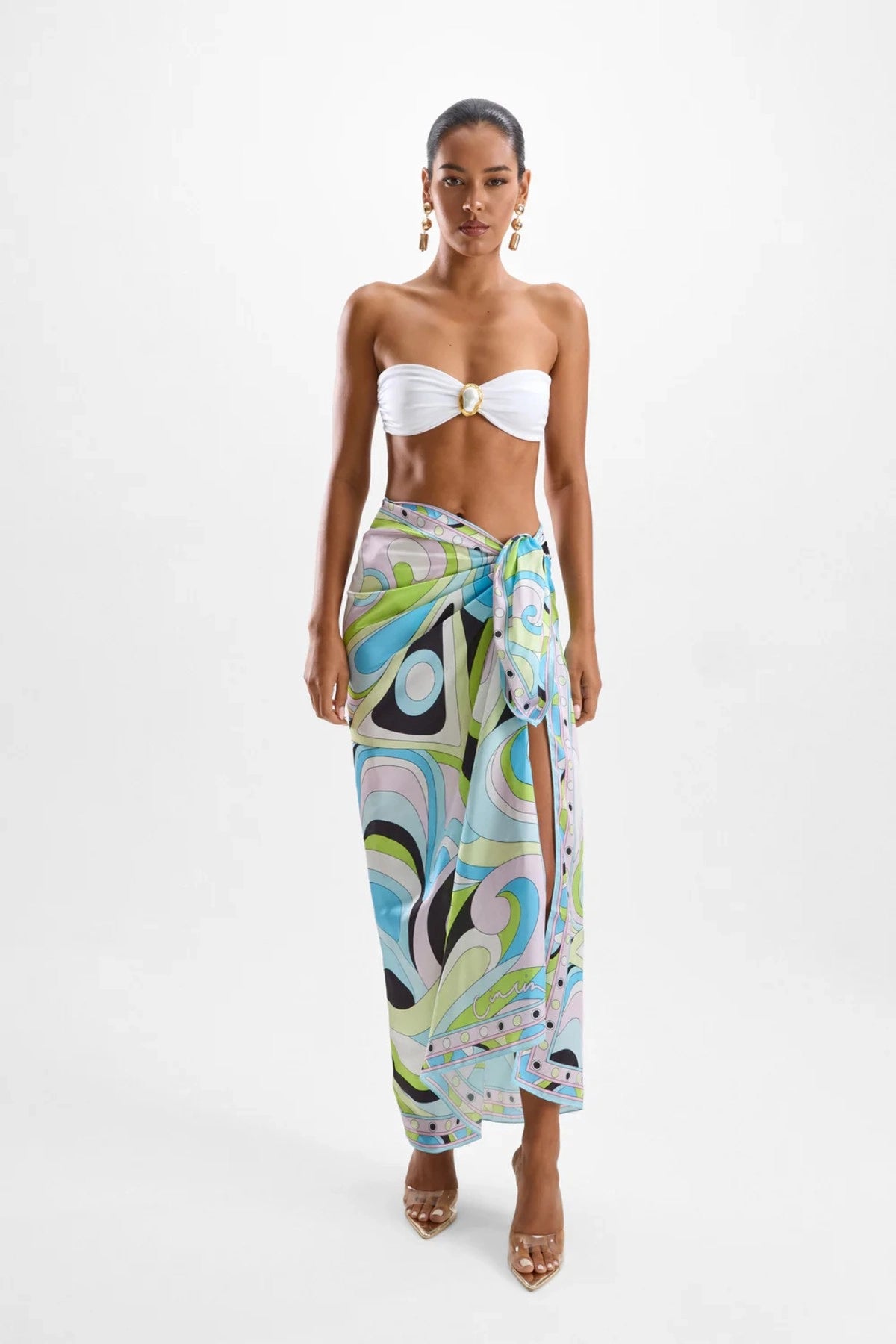 Introducing the Long Scarf in Mars Blue by Cin Cin — a versatile resort accessory that elevates any outfit with its vibrant retrofuturistic print. Crafted in a silky polysatin blend, this oversized scarf can be worn as a sarong, wrap, or styled around the shoulders for effortless vacation layering.