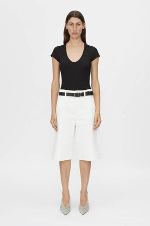 Introducing the Camilla and Marc Jude Denim Short in Salt. A fresh update to your warm-weather wardrobe, this Bermuda-style short is crafted from premium cotton for structure and comfort. Designed with a mid-rise waist and a knee-length wide-leg silhouette, it offers a relaxed yet polished look. Featuring a classic five-pocket design and a fly front button closure, these shorts are perfect for effortless styling with tanks, shirts, or oversized blazers.