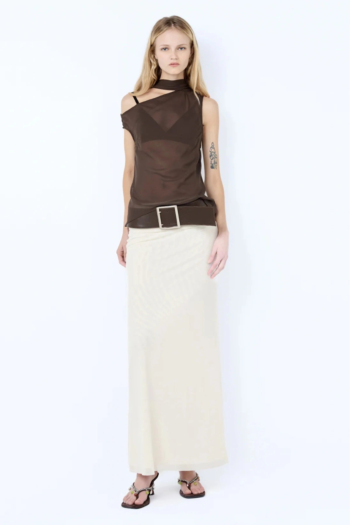 Introducing the Augustin Scarf Top by Bec + Bridge — a delicate statement top crafted from single-layer georgette. Featuring an asymmetric neckline, sheer finish, and elegant neck scarf detail, this refined silhouette is designed for elevated evening wear.