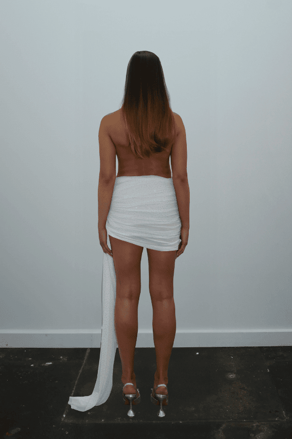 • Tiffany Dress Ivory Glitter by DŽO – Trendy rhinestone-embellished sheer mesh mini with cowl neckline, ruched skirt, and dramatic side train, perfect for glamorous evening statement occasions.
