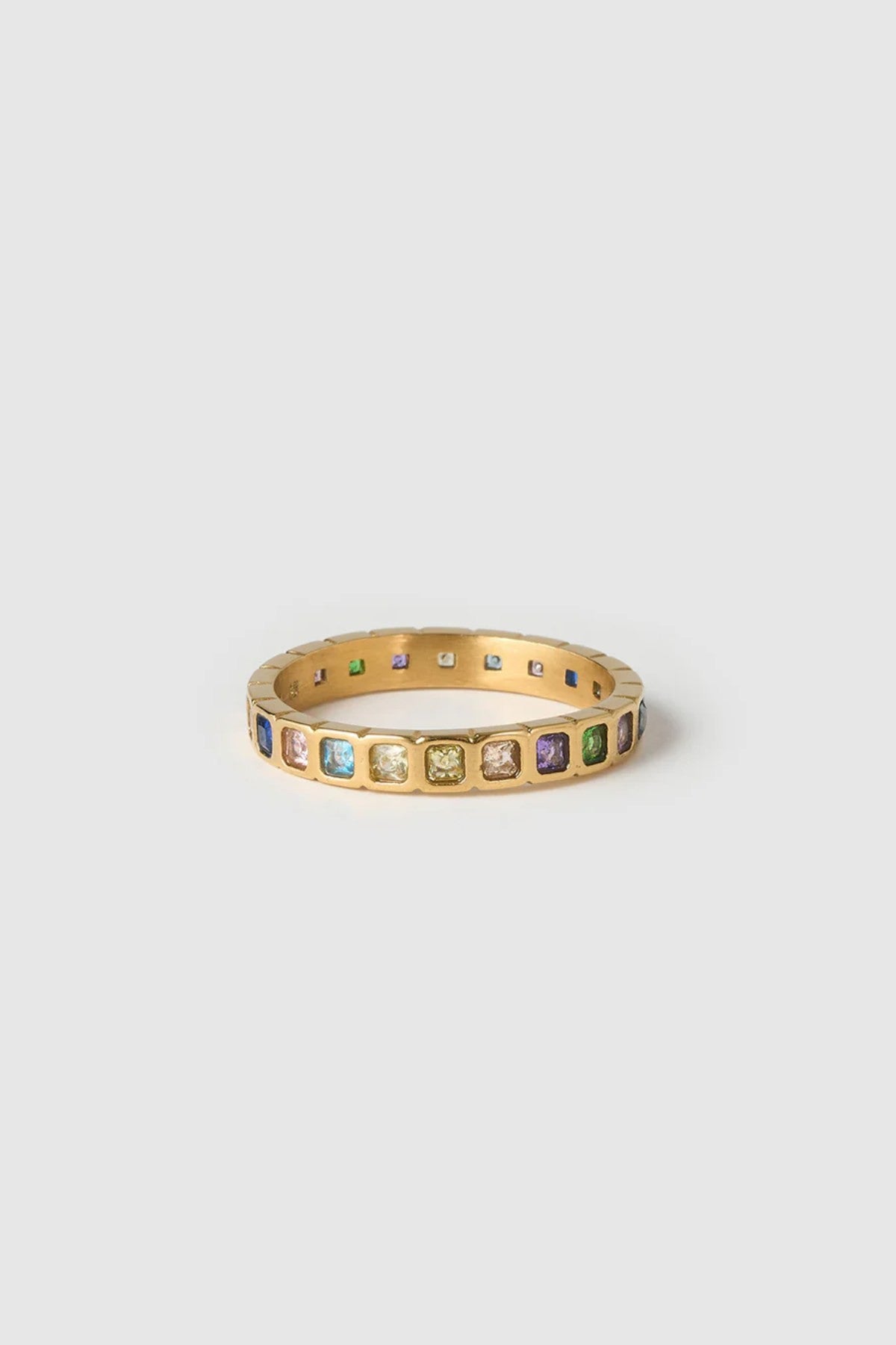 • Quinn Gold Ring Multi by Arms of Eve, a 14k gold PVD stacking ring with multi-coloured cubic zirconia stones.