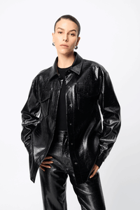 Introducing the Mossman Salt Water Pant. Designed to make an impact, these high-rise trousers are crafted in striking black faux croc leather. Featuring a straight leg silhouette, jean-style front slanted and rear patch pockets, and belt loops for styling versatility, they blend fierce style with everyday practicality. Pair with a fitted top for an effortlessly chic look or team with the matching Salt Water Shirt for a bold, coordinated ensemble.