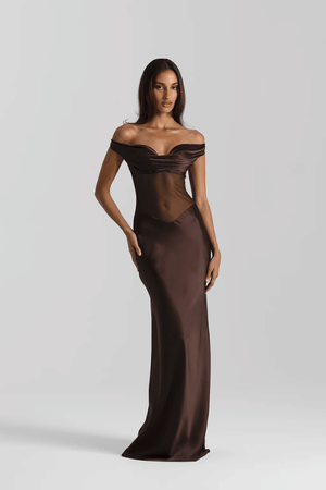 A showstopping expression of sculptural elegance, the Gwyneth Gown in Espresso by Natalie Rolt is crafted to captivate. Featuring a fluid silk skirt and sheer mesh bodice, this off-shoulder silhouette combines soft draping with precise structure. The deep espresso hue enhances its dramatic impact, while the handcrafted Australian design ensures a flawless fit. Perfect for statement evenings and elevated occasions.