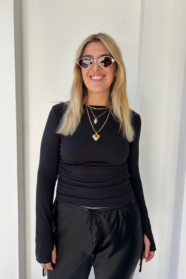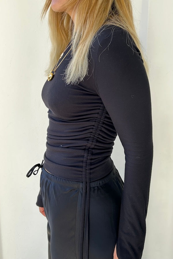 Embrace effortless sophistication with our Sneaky Link Lumi Cropped Top in White. Crafted from 95% bamboo and spandex, this soft long sleeve top offers versatility with adjustable tie sides, allowing you to wear it cropped or long to suit any occasion.