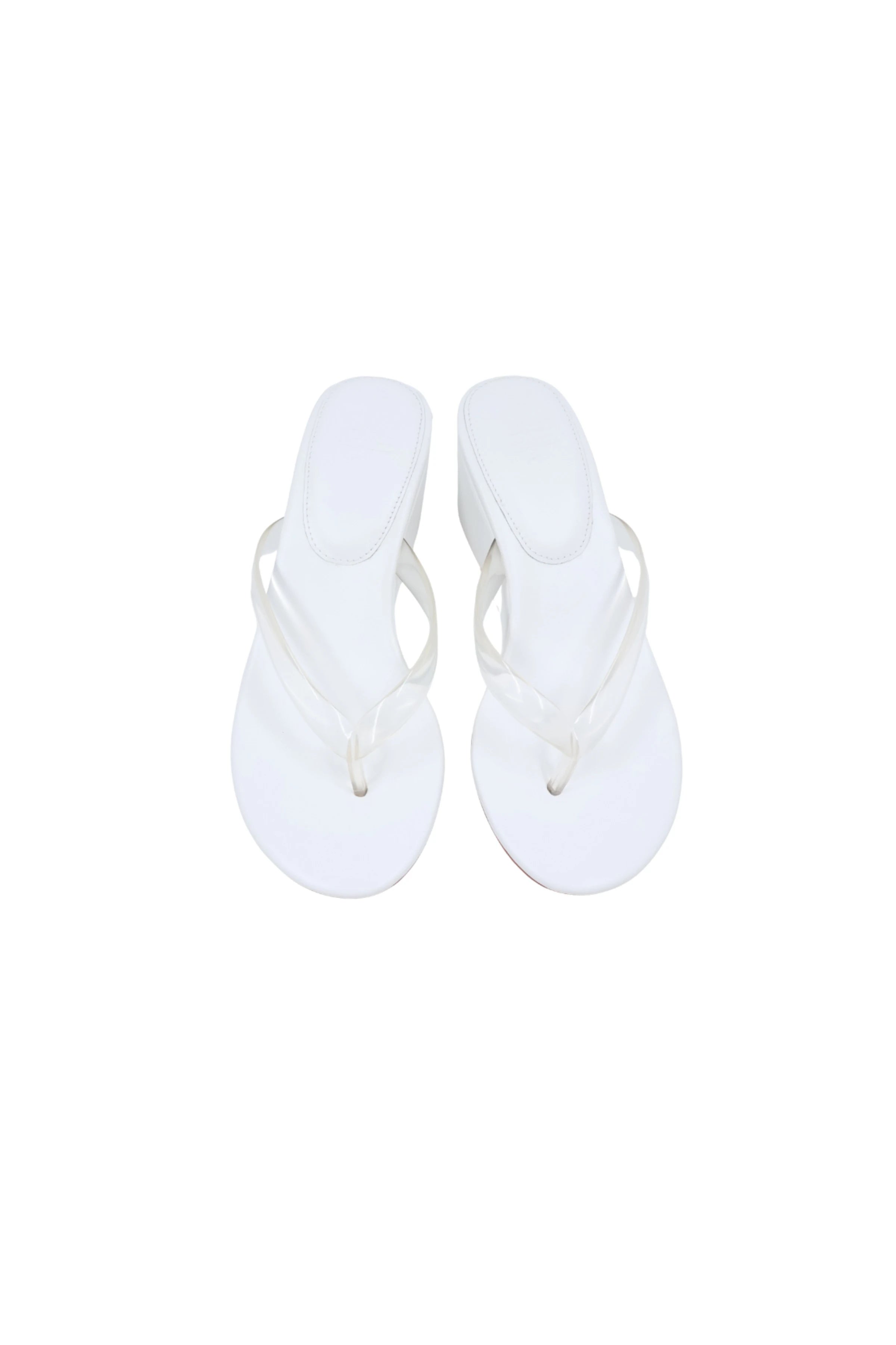 The Deanna Clear Thong Wedge in White & Clear by Sneaky Link - a sleek summer essential with effortless elevation. Crafted with a minimalist clear upper and cushioned leather base, this wedge delivers modern simplicity, all-day comfort, and wear-with-anything versatility.