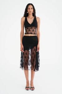 The Margot Tank by Benni is a V neck silloutte crafted in a romantic stretch lace. The bust is fully lined and the waist is kept sheer, showcasing the vintage-inspired lace. Pair back with the Flynn Midi Skirt for the complete look.