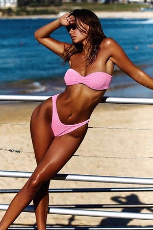 One of our most popular styles, the Hunza G Jean is truly for everyone. Moderate adjustable coverage on both top and bottom provides wearability for most. Bow-style bandeau top and classic bottoms, both in our signature crinkle. Perfect for mixing with other crinkle bikinis, or worn alone in all its glory.