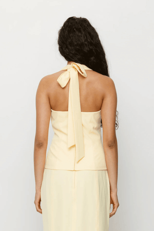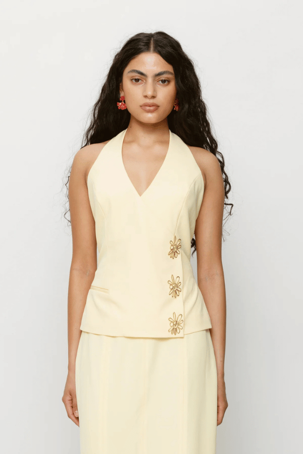 Introducing the The Wolf Gang Inka Vest Top in Aqua. Merging tailored polish with signature TWG flair, this vest-style halter features an asymmetric front closure with custom hardware and a zip at the back for easy wear. Pair it with the matching Inka Skirt for a coordinated set or style it back with denim for effortless edge.