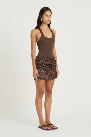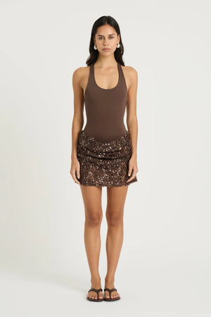 Introducing the Benni Ariel Mini Dress in Cocoa, a sleek mini-length silhouette featuring a stretch bodysuit base with a scoop neckline and racerback detail. The sequin skirt drapes into a soft cowl for added texture and shine—perfect for making a statement at your next event.