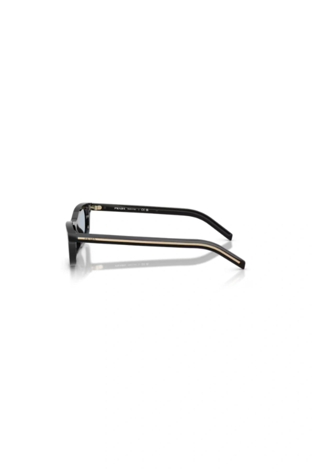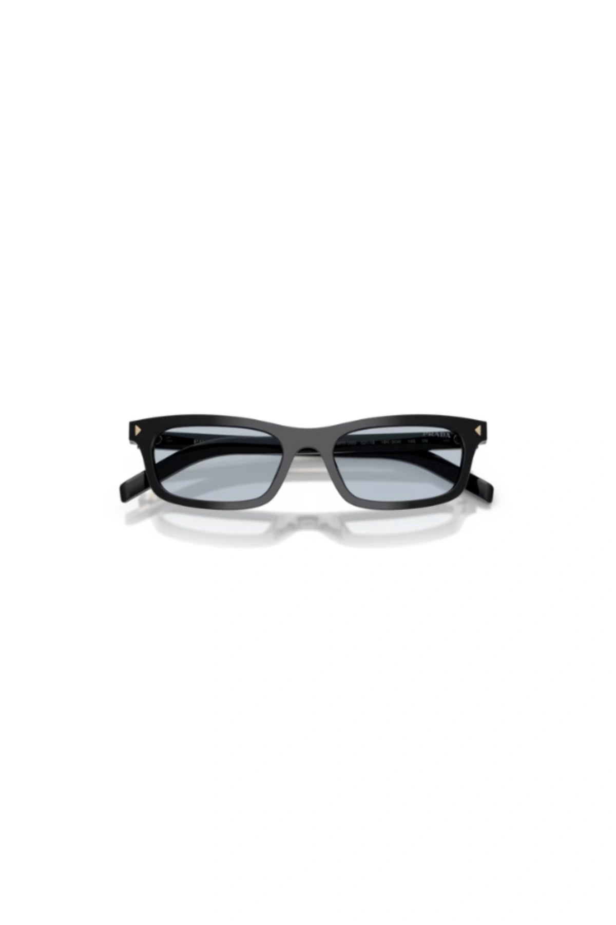 A refined rectangular frame meets slim temples, accented by a full-length metal logo plaque that, on most models, creates a striking tonal contrast against the acetate.
